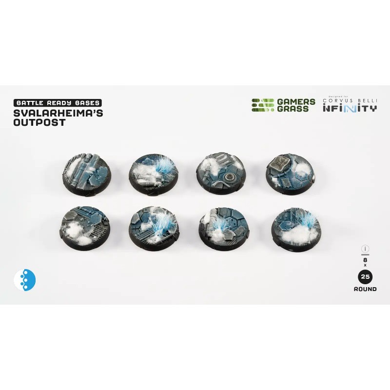 Ce pack contient 8 socles ronds Battle Ready peints et finis à la main. Chaque socle met en valeur les détails et les textures du thème Svalarheima’s Outpost, offrant un rendu professionnel et immersif dès l’ouverture du blister. Ces bases renforcent l’atmosphère et la stratégie de vos parties « Infinity », parfaites pour représenter les opérations et affrontements sur ce monde glacé et inhospitalier.