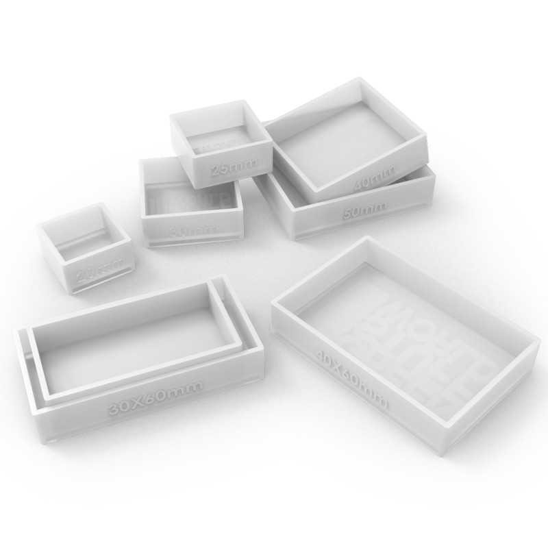 Ces moules couvrent les tailles standard utilisées pour les bases de jeux de figurines : 20x20 mm, 25x25 mm, 30x30 mm, 40x40 mm, 50x50 mm, 25x50 mm, 30x60 mm et 40x60 mm, avec une hauteur de 10 mm. Pour éviter les déformations causées par la chaleur générée lors de la polymérisation de la résine, il est recommandé de verser la résine en fines couches successives. Ne déplacez pas les moules avant le durcissement complet pour prévenir l’apparition de bulles internes dues à l’air piégé.