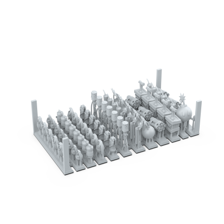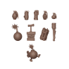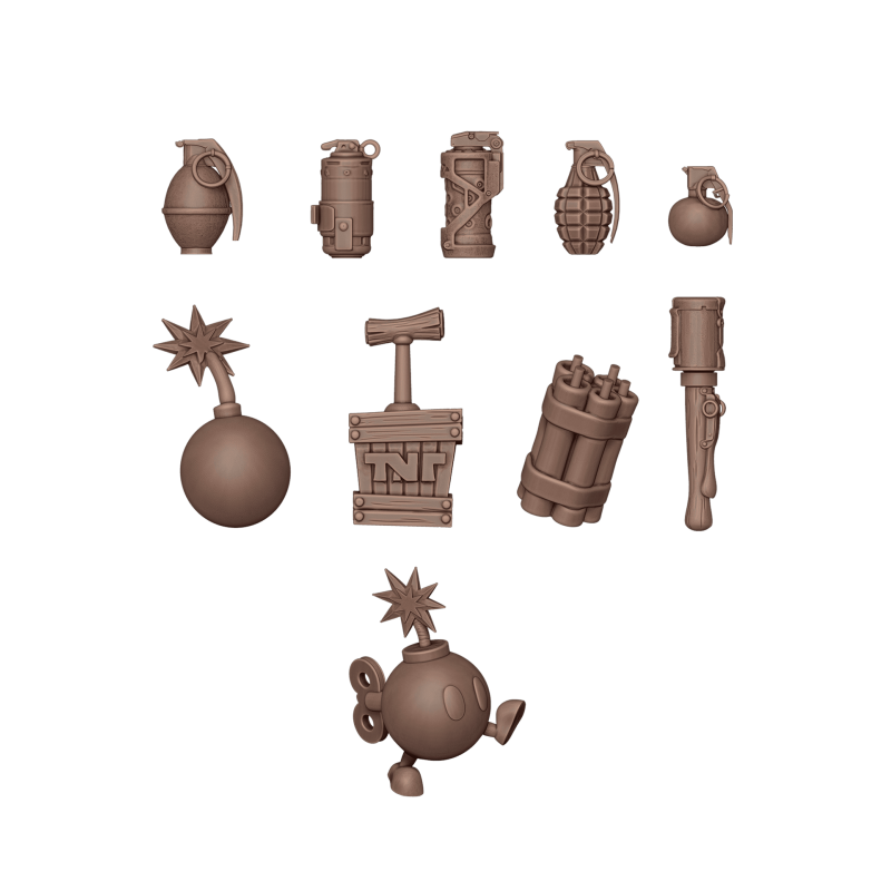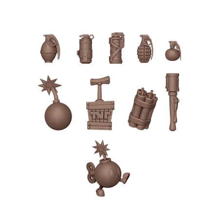 J'en profite !Ce bit en résine contient un ensemble d’engins explosifs pour décorer les socles et compléter les ceintures des soldats en guerre. Il inclut différents types de grenades, anciennes et modernes, offrant une variété d’esthétiques et de styles.