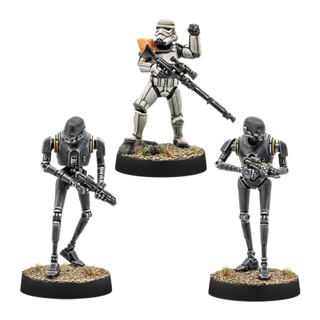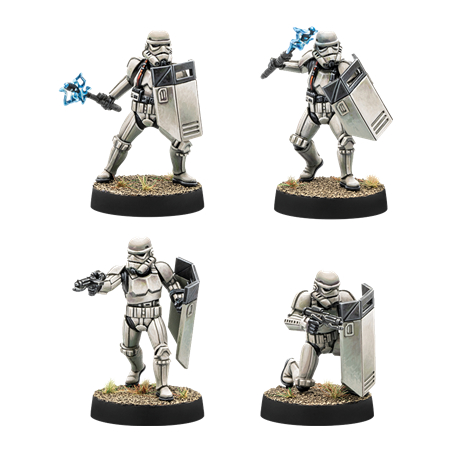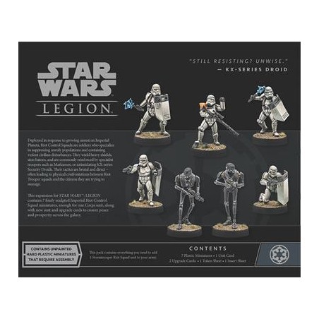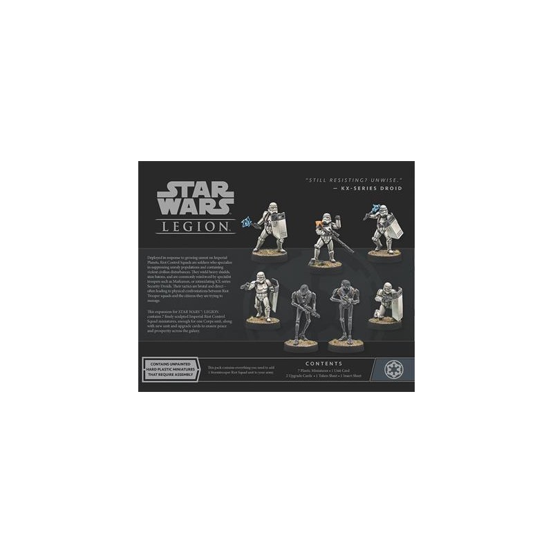 J'en profite !Déployées pour répondre aux troubles qui éclatent sur les mondes sous contrôle impérial, les Escouades Antiémeutes se spécialisent dans le maintien de l’ordre et répriment sans hésitation toute violence provenant de populations civiles. Armés de boucliers lourds et de matraques étourdissantes, ces soldats sont souvent accompagnés de tireurs d’élite ou de redoutables droïdes de sécurité KX.
