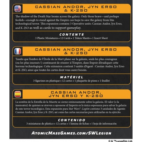 Cette extension contient trois figurines en plastique à assembler et non peintes, représentant chacune un Agent, ainsi que toutes les cartes mises à jour pour les nouvelles règles du jeu. Elle regroupe les figurines précédemment proposées dans les boîtes SWL31 et SWL59. Une boîte de démarrage Star Wars™: Legion est nécessaire pour utiliser cette extension. Le set inclut 11 cartes (3 cartes Unité, 2 cartes Amélioration, 6 cartes Commandement), une planche de pions et un feuillet, offrant ainsi tous les éléments nécessaires pour intégrer ces héros iconiques dans vos parties et enrichir vos scénarios de manière tactique et immersive.