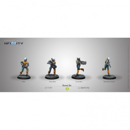 Deux Kuang Shi sont équipés d’un fusil à chaîne, offrant une puissance de feu soutenue et une grande efficacité en combat rapproché. Un Kuang Shi utilise un fusil d'abordage, idéal pour neutraliser rapidement les adversaires dans les engagements rapprochés. Enfin, un Kuang Shi avec un pistolet assure une flexibilité et un soutien complémentaire, capable de s’adapter à différents scénarios tactiques.