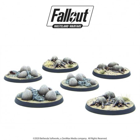 Ce coffret contient trois Mirelurk Hatchlings et trois Mirelurk Eggs, pour un total de six figurines en résine multi-parties de haute qualité à l’échelle 32 mm, chacune avec un socle scénographique unique de 40 mm. Les modèles sont fournis non peints et nécessitent un assemblage. L’utilisation de ce set nécessite l’extension Enclave Wave Card Expansion Pack, mais des cartes téléchargeables pour ce set seront disponibles en juin. Ce coffret enrichit vos parties de Fallout: Wasteland Warfare avec des essaims de créatures emblématiques, idéales pour des scénarios de menace constante et de combat en groupe.