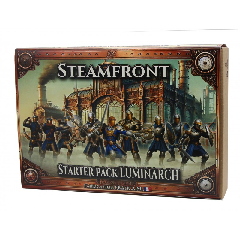 Ce starter dédié à la faction des Luminarch constitue un excellent point d’entrée pour découvrir Steamfront. La boîte contient 9 figurines imprimées en 3D en résine haute résistance, accompagnées de 9 socles texturés. Elle inclut également les règles, les cartes de profils ainsi que tous les pions, dés et tokens nécessaires pour jouer immédiatement. La force Luminarch se compose d’un Champion, de 2 Protecteurs, de 3 Archers et de 3 Gardes épée-bouclier. Un ensemble complet pour prendre en main une faction polyvalente, orientée contrôle du terrain et coordination tactique.