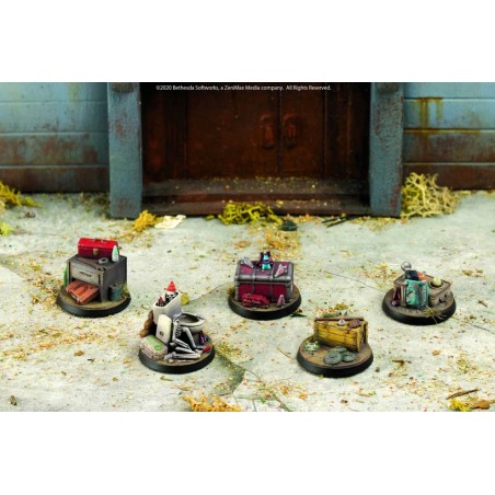 Ce set comprend également des récompenses plus inattendues : kits de soin, stim packs, injecteurs, grenades ou objets pour renforcer vos capacités S.P.E.C.I.A.L. et booster vos personnages. Les cinq marqueurs d’objectifs en résine de haute qualité à l’échelle 32 mm, avec bases scéniques uniques, permettent d’enrichir vos parties de Fallout: Wasteland Warfare et de reproduire ces caches précieuses sur votre table de jeu.