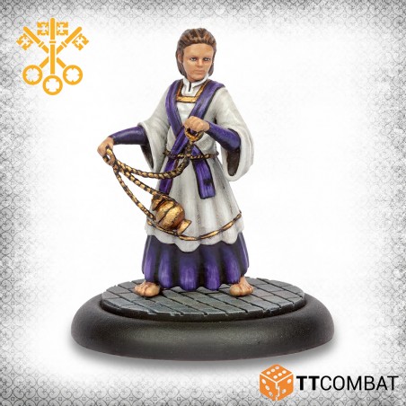Cette boîte constitue une parfaite introduction pour constituer un gang du Vatican. L’Inquisiteur dirige le groupe avec des miracles inquiétants, deux Prêtres font respecter la volonté divine, un Enfant de chœur renforce le gang avec de l’encens, et un Bourreau assure la force brute. Le Vatican se caractérise par un style défensif, capable d’encaisser de nombreux dégâts tout en bénéficiant de bonus à l’échelle du gang, idéal pour une stratégie réfléchie et puissante sur le plateau.