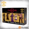 Le set contient cinq figurines en résine et cinq socles en plastique, tandis que les socles illustrés en pierre sont vendus séparément. Les figurines sont fournies non peintes et non assemblées, nécessitant un nettoyage et un montage, avec éventuellement quelques ajustements mineurs pour reboucher de petits trous. Ce kit offre aux joueurs un gang complet, détaillé et prêt à personnaliser pour leurs parties de Carnevale.