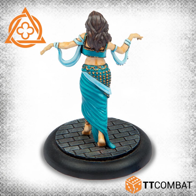 Fadhila est un personnage Doué, ce qui lui permet de rejoindre la Commedia dell’Arte pour former un gang complet, ou d’être intégrée à n’importe quelle autre faction, offrant ainsi une protection exceptionnelle à ses alliés. Le kit contient une figurine en résine et un socle en plastique, tandis que le socle en pierre illustré est vendu séparément. Les figurines sont fournies non peintes et non assemblées, nécessitant nettoyage et montage, avec éventuellement quelques ajustements mineurs pour reboucher de petits trous.