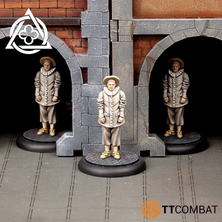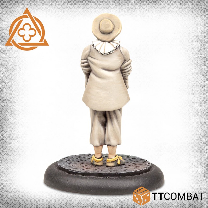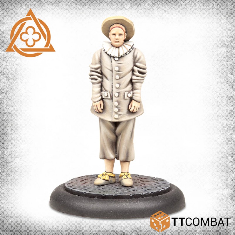 Ce kit contient 3 figurines en résine et 3 socles en plastique, tandis que les socles illustrés en pierre sont vendus séparément. Les figurines sont fournies non peintes et non assemblées, nécessitant nettoyage et montage, avec éventuellement quelques ajustements mineurs pour reboucher de petits trous. Pierrot apporte une dynamique imprévisible et subtile à vos parties de Carnevale.