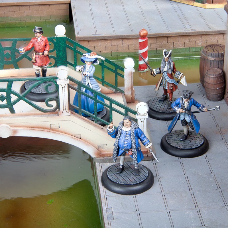 Ce kit contient 5 figurines en résine et 5 socles en plastique. Les socles en pierre illustrés ne sont pas inclus. Les figurines sont livrées non peintes et non assemblées, nécessitant un nettoyage et un assemblage, avec éventuellement le rebouchage de quelques petits trous. Ce set offre aux joueurs la possibilité de renforcer leurs gangs de Patriciens avec des personnages uniques, polyvalents et stratégiquement puissants, parfaits pour dominer les canaux et ruelles de Venise.