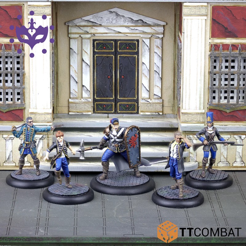 Les gardes municipaux font partie des Patriciens et chacun d'eux dépasse ses pairs en compétence et discipline. Le champ de bataille est sous contrôle grâce à un tireur d'élite capable de neutraliser des ennemis à longue distance, deux sentinelles qui maintiennent la position et un garde lourd prêt à encaisser les coups. Le vétéran de sept ans apporte expérience et inspiration à ses camarades, guidant la troupe avec audace et stratégie.