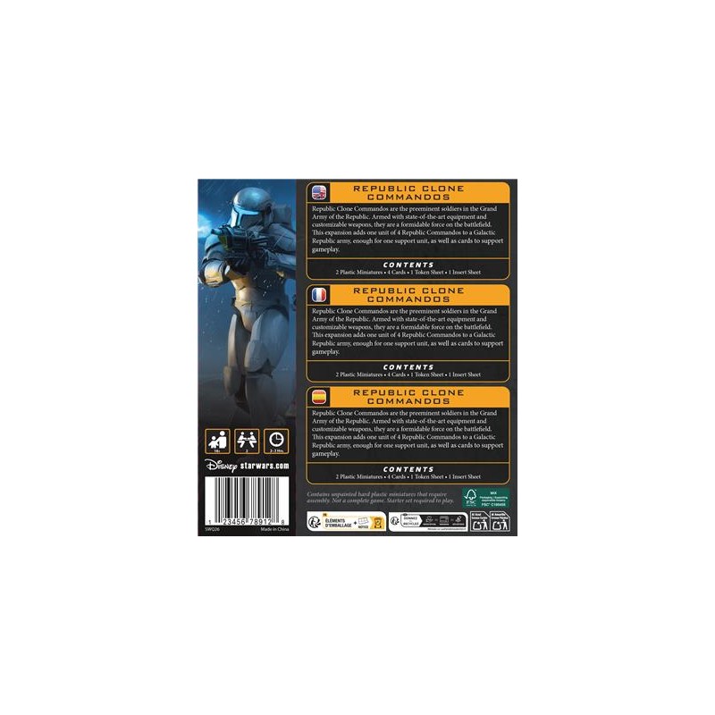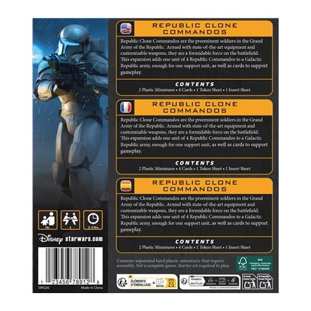 La boîte contient quatre figurines en plastique à assembler et non peintes, quatre cartes (deux Unité, deux Amélioration), une plaquette de pions et un feuillet explicatif. Les cartes sont mises à jour pour correspondre aux dernières règles de STAR WARS™: LEGION. Ces figurines nécessitent une boîte de démarrage STAR WARS™: LEGION pour être utilisées et ajoutent une dimension stratégique et dynamique à vos parties avec des unités d’élite prêtes à affronter tous les défis.