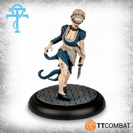 Deux infirmières complètent l’équipe, assurant protection et soins pour maintenir le Docteur en pleine capacité d’action. Enfin, un Fou accompagne le groupe, servant de réservoir d’énergie magique et alimentant les rituels du mage. Le kit contient 5 figurines en résine et 5 socles en plastique. Les socles en pierre visibles sur les illustrations ne sont pas inclus. Les figurines sont fournies non peintes et non assemblées, et nécessitent nettoyage et montage, avec éventuellement un léger rebouchage de petits trous pour un résultat final optimal.