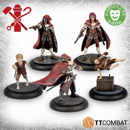 Cette boîte contient un gang complet de la Guilde. Le Prince des voleurs, armé des meilleures armes, dirige ses ouvriers pour maximiser l’efficacité de leurs vols. Les deux Baroni offrent une protection solide et un soutien à distance tout en incitant le gang à agir avec agressivité. Les deux pillards, extrêmement rapides, compensent leur faible puissance offensive par une vitesse et une mobilité exceptionnelles, frappant là où on les attend le moins.