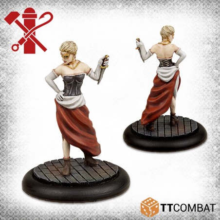 J'en profite !Cette boîte comprend une Matrone du Sang, armée d’une aiguille à moelle, prête à diriger son Clan du Sang avec autorité. À ses côtés, une Couturière scrute les fils du destin et emploie sa magie pour protéger ses sœurs du Coven. Un Coursier du Sang est chargé de transporter le précieux fluide récolté lors des rituels sanglants, assurant ainsi la continuité des pratiques du clan. Enfin, deux prostituées accomplissent les saignées nécessaires, renforçant la puissance mystique du Coven.