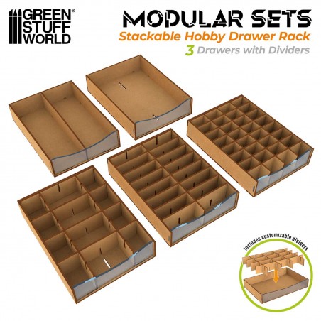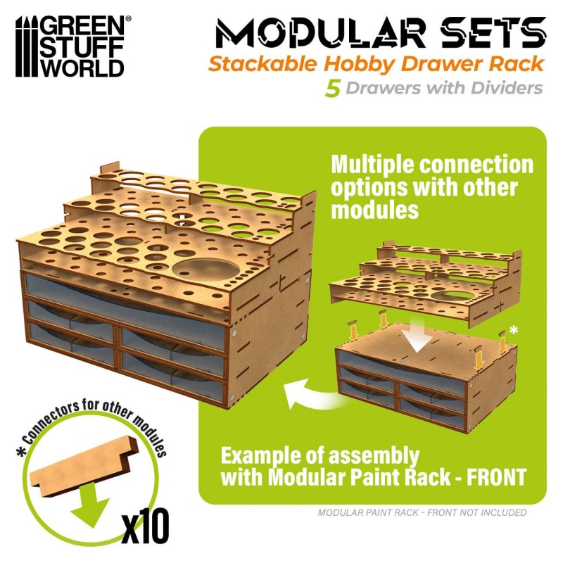 Ce modèle est équipé de cinq tiroirs avec façades en acrylique transparent, permettant de visualiser instantanément le contenu tout en protégeant vos fournitures de la poussière et des manipulations. Les séparateurs personnalisables inclus permettent de créer des compartiments adaptés à vos besoins, facilitant le rangement des peintures, pinceaux, outils de précision, pièces détachées ou accessoires de conversion. Grâce au système d’aimants néodyme inclus, le module peut être empilé ou combiné avec d’autres unités compatibles, assurant un alignement précis et une excellente stabilité, même dans des configurations étendues.