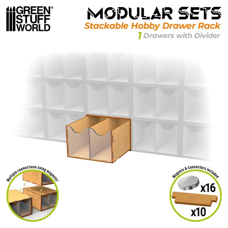 Ce modèle comprend un bac amovible avec façade en acrylique transparent, équipé de séparateurs formant deux compartiments distincts. Cette configuration facilite l’identification rapide du contenu tout en protégeant efficacement vos peintures, pots de pâte, miniatures ou outils. Grâce au système d’aimants néodyme intégré, le module peut être connecté ou empilé avec d’autres unités compatibles afin de créer des combinaisons stables et parfaitement alignées. Cette modularité permet d’optimiser votre flux de travail et de garder l’essentiel toujours à portée de main.