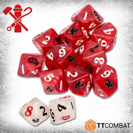 Ce pack contient 12 dés à dix faces, dont 10 dés rouge Guilde, couleur symbolisant la puissance et l’autorité de cette faction marchande, ainsi que 2 dés du Destin de couleur blanche. Chaque face numérotée est délicatement gravée pour assurer une excellente résistance à l’usure et une lecture claire des résultats. Le symbole du lion de Carnevale remplace le chiffre 10, offrant une signature visuelle cohérente avec l’identité du jeu. Cette conception soignée garantit à la fois style et fonctionnalité durant les parties.