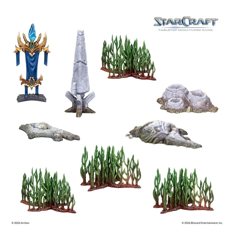 Sur la table, cet ensemble de terrain transforme chaque partie en une confrontation stratégique immersive digne des plus grandes batailles de StarCraft. La boîte comprend 15 éléments de décor, un tapis de jeu en tissu mesurant 137 × 91 cm (54" × 36") ainsi qu’un manuel d’assemblage. Les éléments sont fournis non peints et nécessitent un assemblage.