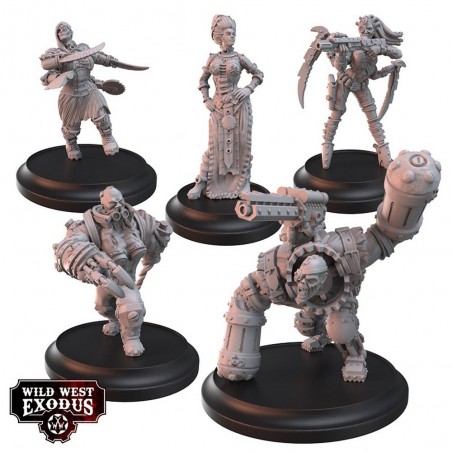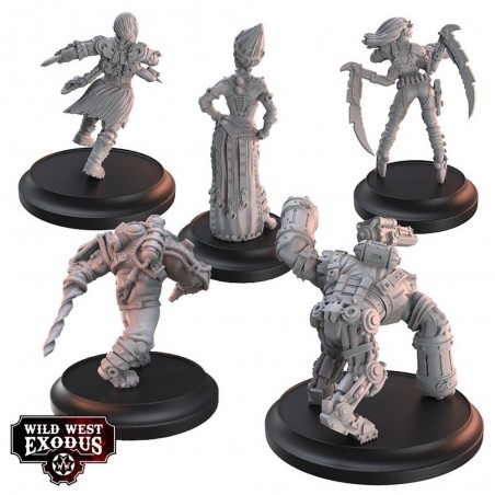 Le coffret Galvanic Mysteries Posse contient cinq miniatures en résine multi-parties : 1x Augusta Byron, 1x Mantis, 1x Creation V, 1x Creation X, 1x Creation XIII et 5 socles. Les miniatures sont fournies non peintes et nécessitent un assemblage. Les cartes d’unité de personnage ne sont pas incluses et peuvent être trouvées sur le site officiel de Wild West Exodus. Idéal pour enrichir vos armées et créer des scénarios captivants mêlant science, innovation et tactique.
