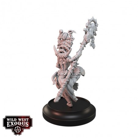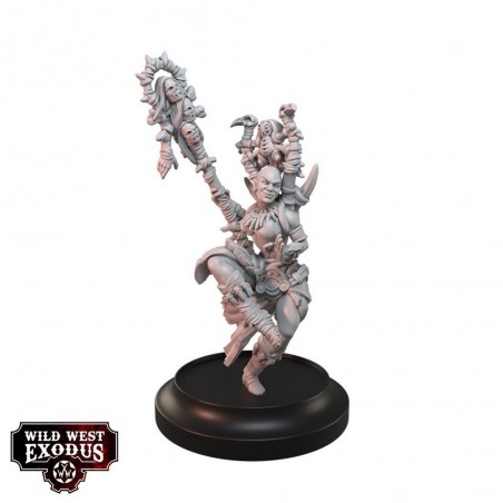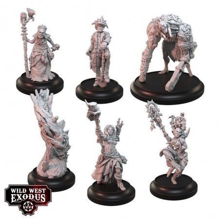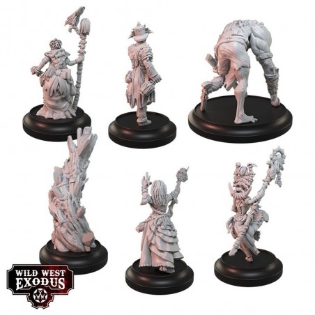 Le coffret Court of the Nazombu Posse contient 5 miniatures en résine multi-parties : Marie Laveau, Cemetary Kriminal, Cleo – Nazombu Crone, Zora – Nazombu Oracle, Jaques Santiago, et 1 Hexalith, ainsi que 6 socles. Les miniatures sont fournies non peintes et nécessitent un assemblage. Les cartes d’unité de personnage ne sont pas incluses et sont disponibles sur le site officiel de Wild West Exodus. Parfait pour enrichir vos armées avec des unités emblématiques, stratégiques et mystérieuses, apportant magie et récit à vos parties.