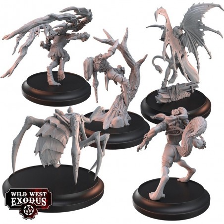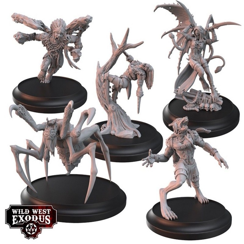 Le coffret Dark Nation Posse contient 5 miniatures en résine multi-parties : Wicasasni, Khali, Camazotz, Seke, Nizhoni, ainsi que 5 socles. Les figurines sont fournies non peintes et nécessitent un assemblage. Les cartes d’unité de personnage ne sont pas incluses et sont disponibles sur le site officiel de Wild West Exodus. Parfait pour enrichir vos armées avec une unité emblématique et maléfique, ajoutant un élément narratif puissant et stratégique à vos parties.