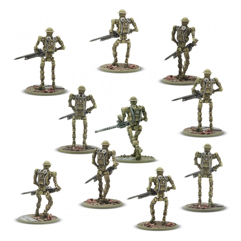 Bien qu’ils manquent de la maniabilité des soldats humains, leur construction robuste leur permet de résister à des dommages considérables. Équipés de mitrailleuses Moyennes ou Lourdes, ils peuvent engager l’ennemi avec une puissance de feu significative. Leur puissance de calcul limitée nécessite cependant des instructions simples et des opérations rapides. Sur les champs de bataille hantés par l’horreur de cette guerre, ces automates sont immunisés contre la peur et la fatigue.