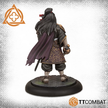 Senshi était un samouraï dévoué qui vivait selon la Voie du Bushido, maîtrisant la technique du Niten Ichi-ryu dans l’espoir de surpasser le record de duels de son héros, Miyamoto Musashi. Après trente et une victoires, le malheur frappa lorsque son seigneur fut mortellement blessé lors d’une embuscade des Tokugawa et que son village fut détruit, le laissant seul, ronin en deuil. Rongé par le désespoir, il erra vers l’ouest à la recherche d’une mort honorable au combat, mais nul ne parvint à le vaincre. À Venise, il tenta le seppuku, mais la magie arcanique d’une faille cosmique le maudit, le condamnant à la non-mort. Désormais, Senshi erre dans la nuit, chassant des ennemis mortels dans une quête désespérée d’une fin ultime et digne.