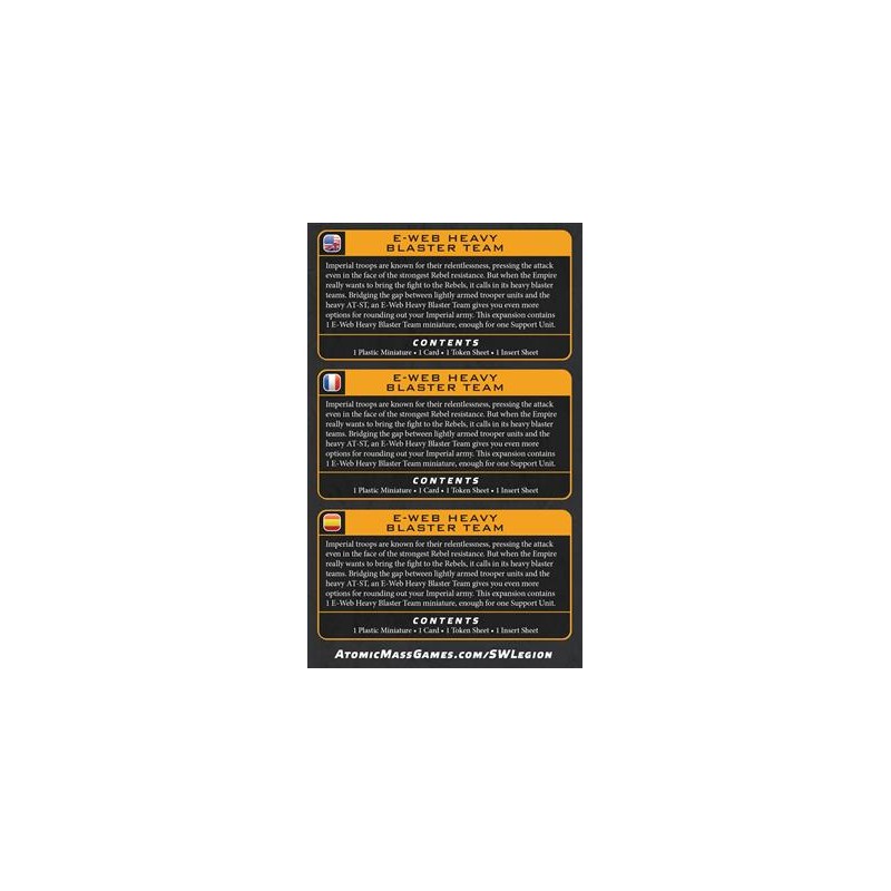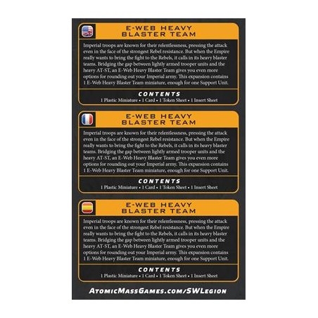 Comblant l’écart entre les unités d’infanterie légère et les imposants marcheurs TR-TT, l’Équipe Blaster Lourd E-Web offre de nouvelles options tactiques pour renforcer votre armée. Cette unité de soutien fournit une puissance de feu soutenue capable de verrouiller des zones clés du champ de bataille et de repousser les assauts ennemis.