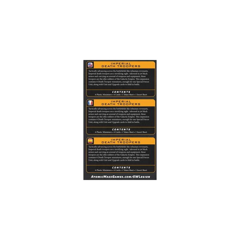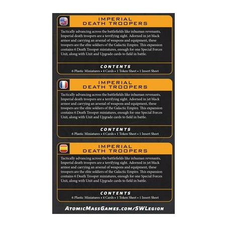 Formés pour opérer dans des conditions hostiles et pour neutraliser rapidement toute opposition, les Death Troopers excellent dans les engagements rapprochés comme dans les échanges de tir prolongés. Leur présence sur le champ de bataille suffit souvent à instiller la peur et à désorganiser les forces adverses avant même le premier tir.