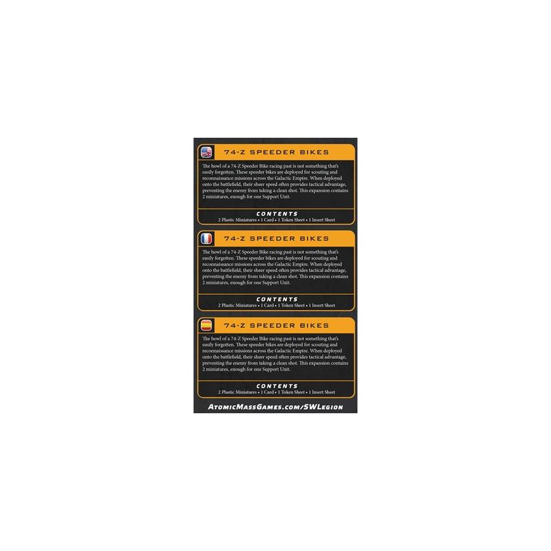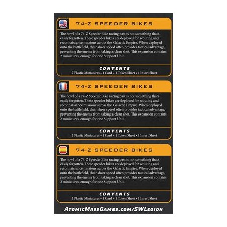 Cette extension permet d’ajouter une unité de soutien mobile et polyvalente à vos armées de Star Wars™: Legion. Les Speederbikes 74-Z sont devenus emblématiques depuis leur apparition dans l’épisode VI de la trilogie originale, lors des scènes sur la lune forestière d’Endor.