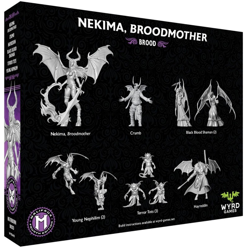 Ce set Malifaux met en avant Nekima, Broodmother, accompagnée de ses rejetons et alliés. Il inclut Nekima, ainsi que Crumb et Hayreddin, soutenus par des Black Blood Shaman, des Young Nephilim et des Terror Tots. Cette force illustre toute la brutalité et la férocité des Neverborn, combinant puissance brute et menace constante sur le champ de bataille, idéale pour enrichir une crew existante ou en constituer une nouvelle.