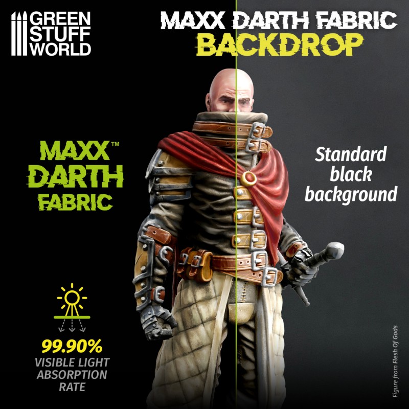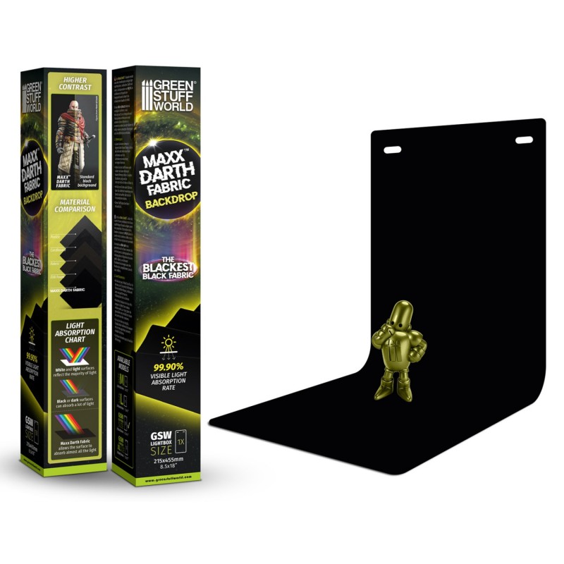 Le tissu Maxx Darth™ pousse cette performance à son extrême. Conçu à partir d’un mélange exclusif de fibres synthétiques floquées, il est capable d’absorber jusqu’à 99,9 % de la lumière visible. Ce niveau d’absorption en fait l’un des matériaux les plus noirs disponibles, garantissant un fond parfaitement uniforme, sans reflets ni parasites visuels, idéal pour la photographie et la vidéo de petits objets.