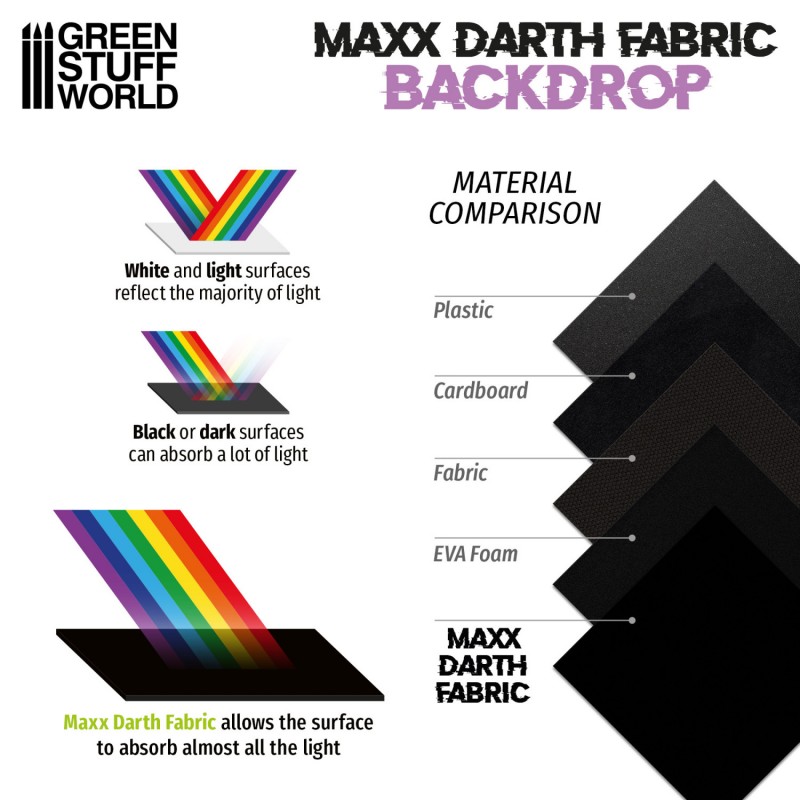Le tissu Maxx Darth™ super noir est conçu à partir d’un mélange exclusif de fibres synthétiques floquées, offrant une capacité d’absorption de la lumière atteignant 99,9 % dans le spectre visible. Cette performance en fait l’un des matériaux les plus noirs disponibles, garantissant un fond homogène, profond et sans reflet pour des prises de vue nettes et contrastées.