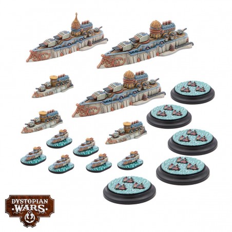Ce Battlefleet de faction permet aux joueurs de débuter ou d’étendre leur collection de Dystopian Wars avec simplicité et cohérence. L’Alliance se distingue par une flotte polyvalente et technologiquement avancée, combinant puissance de feu, protection énergétique et flexibilité tactique. Les vaisseaux bénéficient des avancées scientifiques offertes par le régime du Prince-Président, leur permettant de déployer des armes à haute énergie et des systèmes de défense sophistiqués. Sur le champ de bataille naval, ils forment une force organisée capable de s’adapter à de multiples menaces, en surface comme dans les airs.