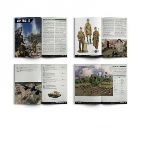 Ce livre d’armée se distingue par son approche particulièrement riche et détaillée. Il propose pas moins de six listes d’armée distinctes regroupées dans ses 128 pages entièrement en couleur. Les joueurs peuvent ainsi constituer des forces australiennes, canadiennes, est-africaines, indiennes, néo-zélandaises et sud-africaines, chacune bénéficiant d’une identité propre et d’une profondeur de jeu inédite. Cette diversité permet de représenter fidèlement les multiples théâtres d’opérations du Commonwealth durant la Seconde Guerre mondiale, tout en offrant une grande variété d’options de construction d’armée.