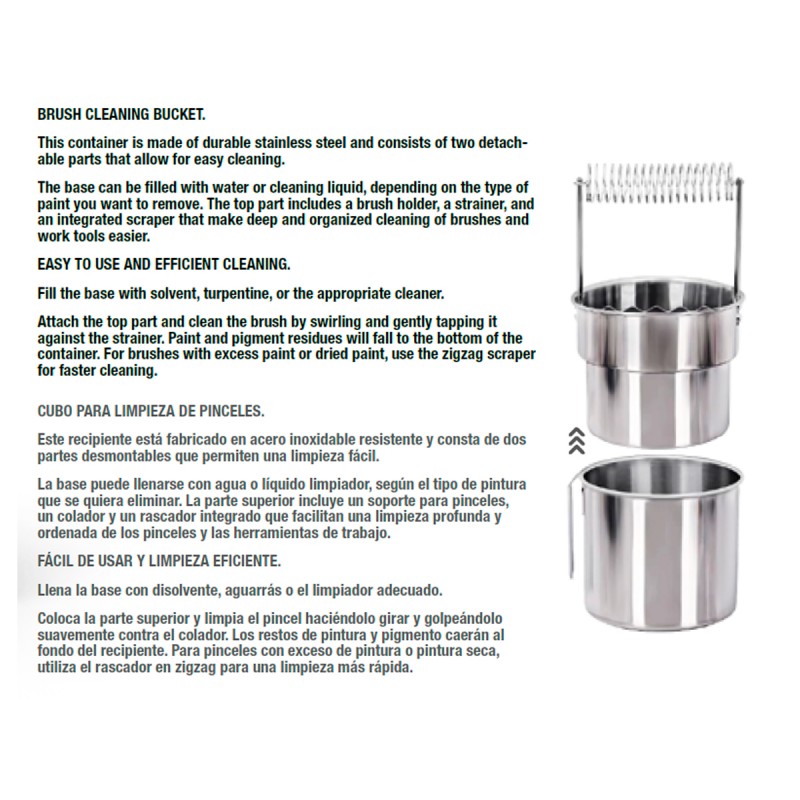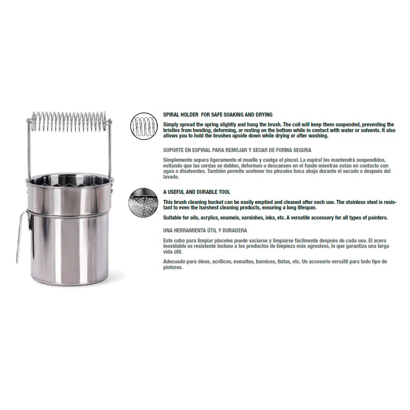 Fabriqué en acier inoxydable, ce seau de nettoyage est conçu pour résister aux solvants les plus puissants et garantir une grande durabilité dans le temps. Facile à vider et à nettoyer, il convient à une large gamme de produits de peinture tels que les huiles, acryliques, émail, vernis ou encres. Un outil polyvalent, fiable et essentiel pour tout artiste ou modéliste souhaitant entretenir efficacement ses pinceaux.