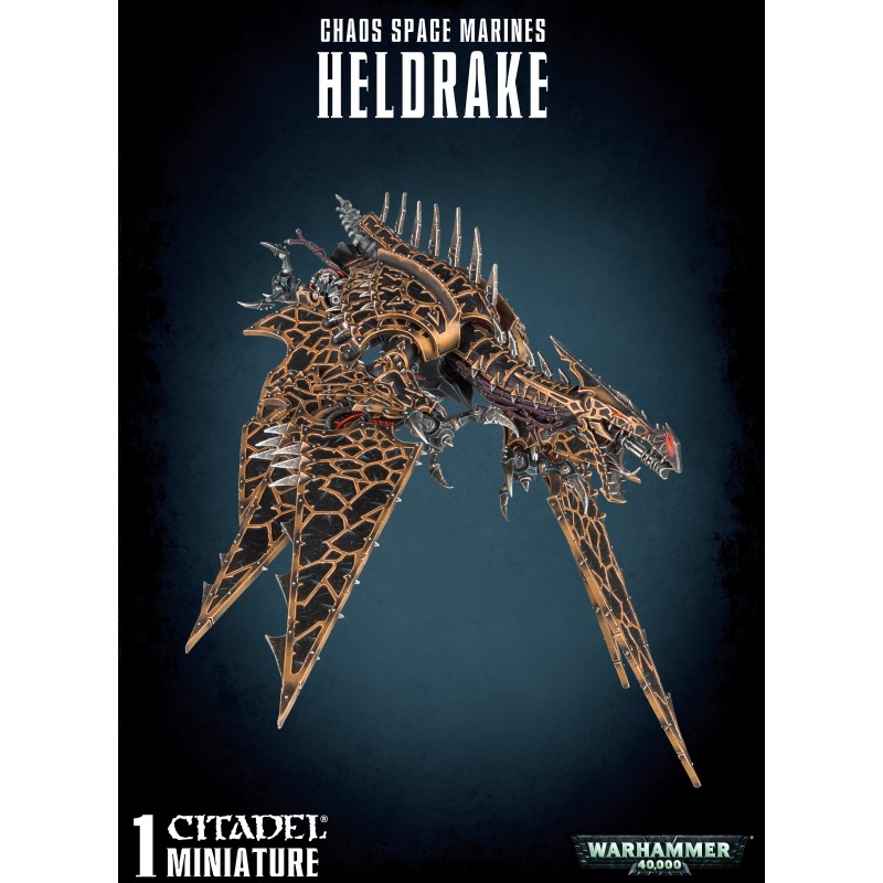 Le Heldrake est un engin ressemblant à un dragon, la fusion de la chair, de l'os et du métal. La figurine est sculptée afin d'avoir l'air de survoler le champ de bataille ; elle est fournie avec de nombreux éléments: des plaques de blindage recouvrent ses ailes, des câbles accrochés à sa queue traînent derrière elle, et il est possible de déceler des tonnes de détails tels que des câbles, des rivets, des pointes et tout un réseau d'arêtes tranchantes sur les plaques métalliques. On peut aussi discerner la marque du Chaos au niveau des épaules et sur les ailes.
