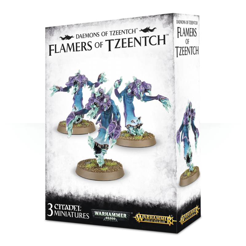 J'en profite !Bondissant d'une manière troublante, les Flamers of Tzeentch foncent sus à l'ennemi en crachant des flammes surnaturelles, le feu Warp du Chaos lui-même. Ces flammèches se tordent comme animées d'une vie propre, tout en consumant la chair, les os et l'âme des ennemis. Mais Celui Qui Altère est capricieux, et des feux éteints peuvent se raviver, ou même accorder la guérison.