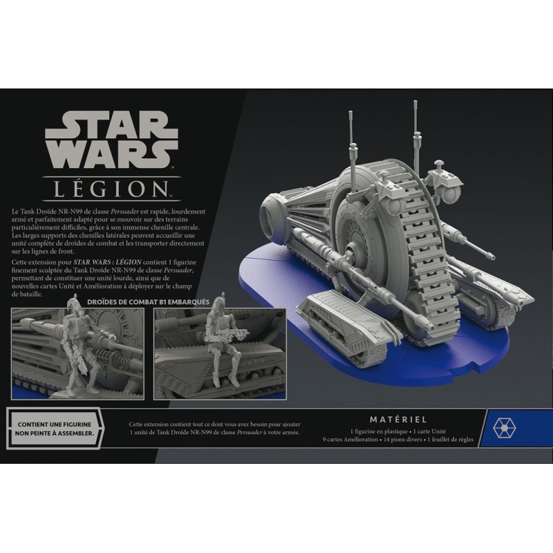 J'en profite !Cette extension regroupe tous les éléments nécessaires pour ajouter le droïde de combat NR-N99 à vos forces séparatistes en tant qu'unité lourde. La figurine non peinte, remarquablement détaillée, comprend deux droïdes de combat B1 optionnels qu'elle peut transporter sur le champ de bataille, et une carte d'unité décrit en détail ses armes et ses systèmes.