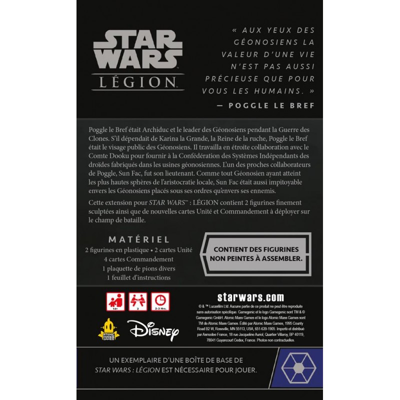 J'en profite !Poggle le Bref occupait le poste d'Archiduc et dirigeait les Géonosiens pendant la Guerre des Clones. Bien que dépendant de Karina la Grande, la Reine de la ruche, Poggle le Bref était le représentant public des Géonosiens. En étroite collaboration avec le Comte Dooku, il veilla à approvisionner la Confédération des Systèmes Indépendants en droïdes fabriqués dans les usines géonosiennes. Son lieutenant, Sun Fac, fut l'un de ses collaborateurs les plus proches. En tant que Géonosien élevé aux plus hautes sphères de l'aristocratie locale, Sun Fac se montrait aussi impitoyable envers les Géonosiens sous ses ordres qu'envers ses ennemis.