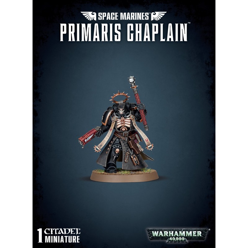 Ce kit plastique contient les composants nécessaire pour assembler un Primaris Chaplain. Dans son armure énergétique Mk X noire de jais aux jambières caractéristiques, il manie avec ferveur son pistolet bolter Absolvor et son crozius arcanum. Sa bure encapuchonnée lui donne un air lugubre prononcé, ce que confortent les pointes, chaînes, crânes et sceaux de pureté dont il est bardé. Son heaume en forme de crâne et son plastron en forme de cage thoracique évoquent la mort qui guette ses ennemis. Son paquetage dorsal comporte un rosarius dont les 12 pointes représentent les Hauts Seigneurs de Terra.