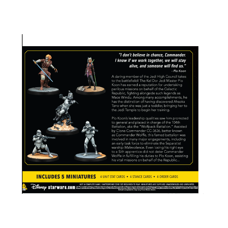 Reconnu pour ses qualités de chef, Plo Koon a été promu au rang de général et s'est vu confier le commandement du 104e bataillon, également connu sous le nom de "Wolfpack Battalion". Avec l'aide du commandant clone CC-3636, ou commandant Wolffe, ce célèbre bataillon a participé à de nombreux engagements importants, comme la première force opérationnelle chargée de neutraliser le vaisseau de guerre séparatiste Malevolence. Même la perte de son œil droit par un apprenti Sith n'a pas dissuadé le commandant Wolffe de remplir fidèlement son devoir en soutenant Plo Koon lors de missions cruciales pour la République