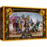 La boîte d'Attachements Baratheon pour le jeu Trône de Fer : le jeu de figurines offre aux joueurs de la Maison Baratheon une multitude de nouvelles options pour renforcer leurs armées, que ce soit pour Stannis ou Renly. Certains des accessoires d'unité seront utiles pour les deux frères, tandis que d'autres seront spécifiques à leurs forces respectives. Quoi qu'il en soit, ces nouvelles options renforceront les troupes déjà bien équipées de la Maison Baratheon, en améliorant leur armure, leur vitesse ou leur endurance sur le champ de bataille.