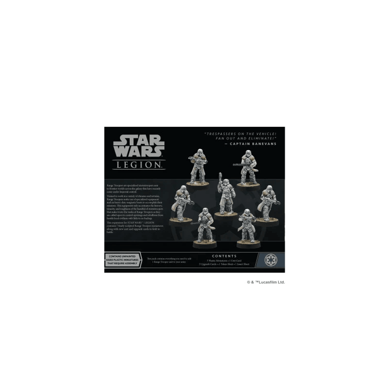 J'en profite !Les redoutables Range Troopers impériaux font leur entrée dans Star Wars™: Legion avec ce nouveau pack ! Les sept figurines de Range Troopers offrent aux joueurs une nouvelle option robuste pour les forces spéciales impériales, capables de s'avancer au cœur de la bataille tout en déployant leurs puissants fusils blasters E-10R. Ces figurines sont accompagnées d'une figurine d'arme lourde qui renforce encore la puissance de feu de l'unité. Grâce à leur capacité à traverser aisément des terrains difficiles, les Range Troopers sont accompagnés de six cartes d'amélioration qui permettent aux joueurs de les adapter à leur propre stratégie.