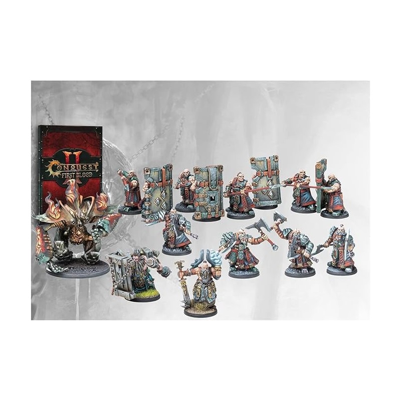 Votre Warband Dweghom First Blood comprend 17 figurines : un socle de 4 pièces chacun pour les Fireforged et les Wardens, un socle de 6 pièces pour les Hold Warriors, une Brute Premium Steelforged, un Steelshaper trempé, et l'Officier, le Flamecaster. Ce coffret est également accompagné d'un guide de démarrage rapide de First Blood, de toutes les cartes de commandement nécessaires avec les codes QR pour l'application permettant d'accéder au constructeur d'armée gratuit et aux règles, de socles et de supports pour chaque figurine, et d'une notice d'assemblage. Si ce Warband est parfait pour débuter votre jeu First Blood, ces figurines sont également prêtes à être utilisées dans le jeu de bataille fantastique de masse Last Argument of Kings grâce aux plateaux de mouvement fournis.