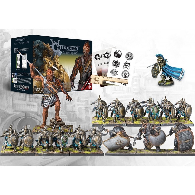 J'en profite !Un ensemble de départ complet pour 1 joueur, prêt pour des parties passionnantes de First Blood ou The Last Argument of Kings. Comprend 29 figurines City States, deux guides de démarrage rapide, toutes les cartes de commandement nécessaires, des socles et des supports, des manuels d'assemblage, des brochures Path of Conquest, une carte Conquest EA en papier, un décalque du logo du 5e anniversaire et un outil de mesure du 5e anniversaire !