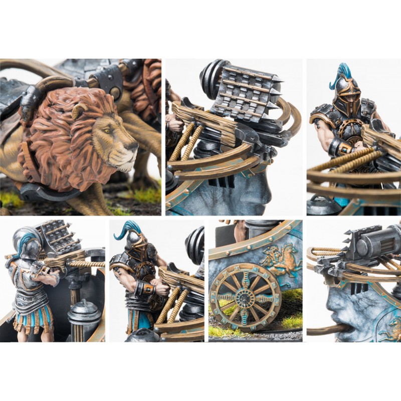 Bien que l'efficacité du Flogobolon et du Skorpios soit reconnue depuis longtemps par les Cités-États, celles-ci ont longtemps peiné à les déployer de manière rentable sur le champ de bataille. Dans un coup de génie, la Gérousie d'Hélias a invité les maisons marchandes et nobles à financer la construction de ces véhicules mortels. La frénésie de dépenses et de sur-ingénierie qui s'ensuivit s'est ensuite propagée aux autres Cités-États et à leurs patrons nobles. Ces armes sont des merveilles d'ingénierie que seuls les Dweghom pourraient espérer égaler. Les châssis des chars, faits de bois solide et de métal, protègent à la fois le cavalier et l'arme... Les lions, quant à eux, servent simplement à proclamer la richesse et le pouvoir de leurs mécènes.