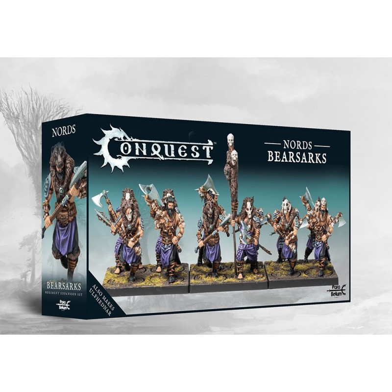 Nés des anciens pavillons de chasse des Nords, les Bearsarks sont depuis longtemps une terreur sur et en dehors du champ de bataille. Leur nature insulaire, leurs pratiques occultes et leur férocité débridée les rendent dangereux tant pour les alliés que pour les ennemis, la plupart des loges de Bearsark se livrant au brigandage et au pillage parmi les terres nordiques lorsqu'elles ne sont pas directement employées par un Jarl entreprenant ou un Chaman. Sur le champ de bataille, leur férocité débridée, leur mépris du danger et leur force brutale font d'eux des combattants d'avant-garde idéaux, où leurs armes à deux mains vicieuses tournent en dérision toutes les formations défensives derrière lesquelles l'ennemi pourrait se cacher. Comment ils jouent : Un régiment lourd d'élite, chargeant aveuglément et déchaînant des attaques dévastatrices de haute qualité (Cleave (2)) avec Linebreaker, ils sont destinés à venir à bout de tous sauf des adversaires les plus coriaces, hors des Objectifs et autres zones d'importance sur le champ de bataille.