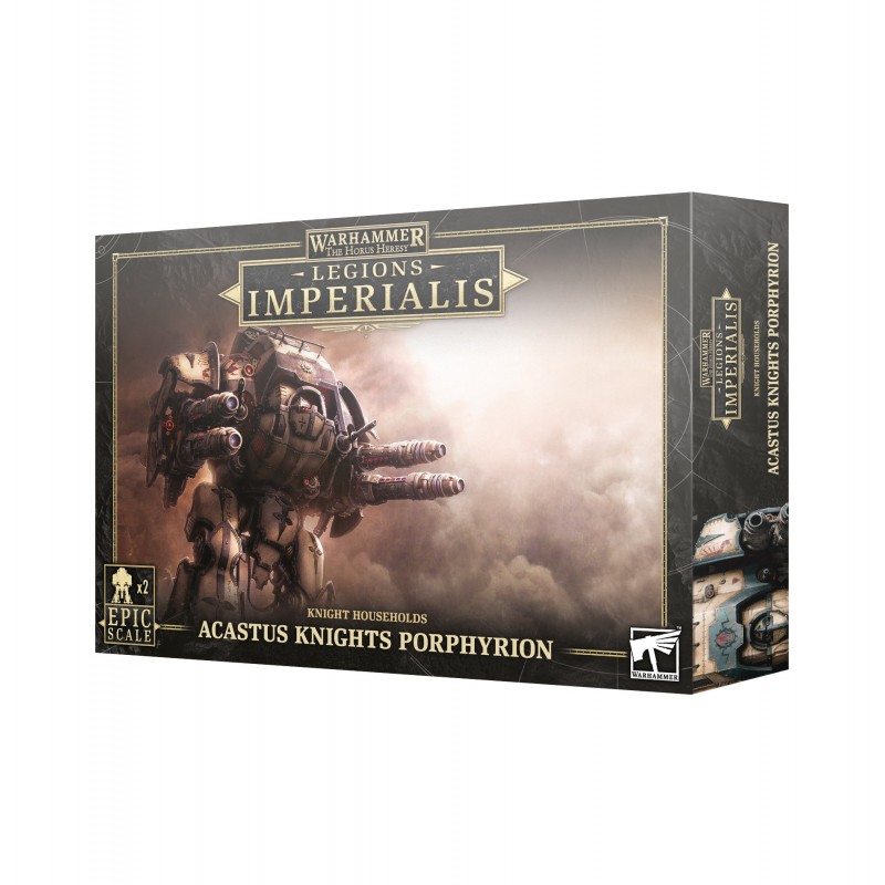 Ce kit plastique permet d'assembler deux Acastus Knight Porphyrion à l'échelle épique. Chaque machine est armée de deux magna-canons laser et peut être équipée de missiles de défense Helios ou d'une nacelle lance-missiles Ironstorm, ainsi que de canons laser ou autocanons Acastus montés sur la coque.